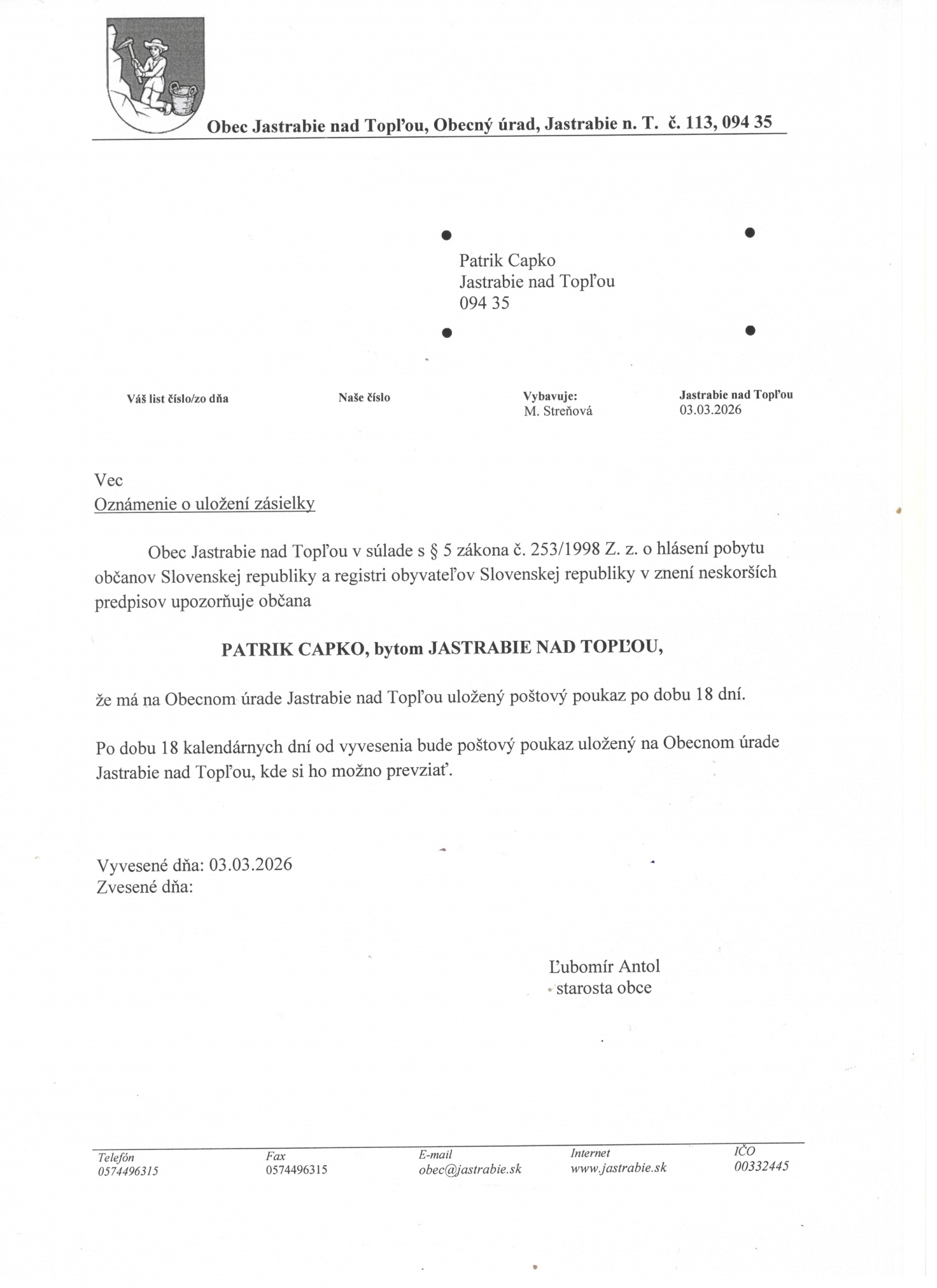 Oznámenie o uložení zásielky